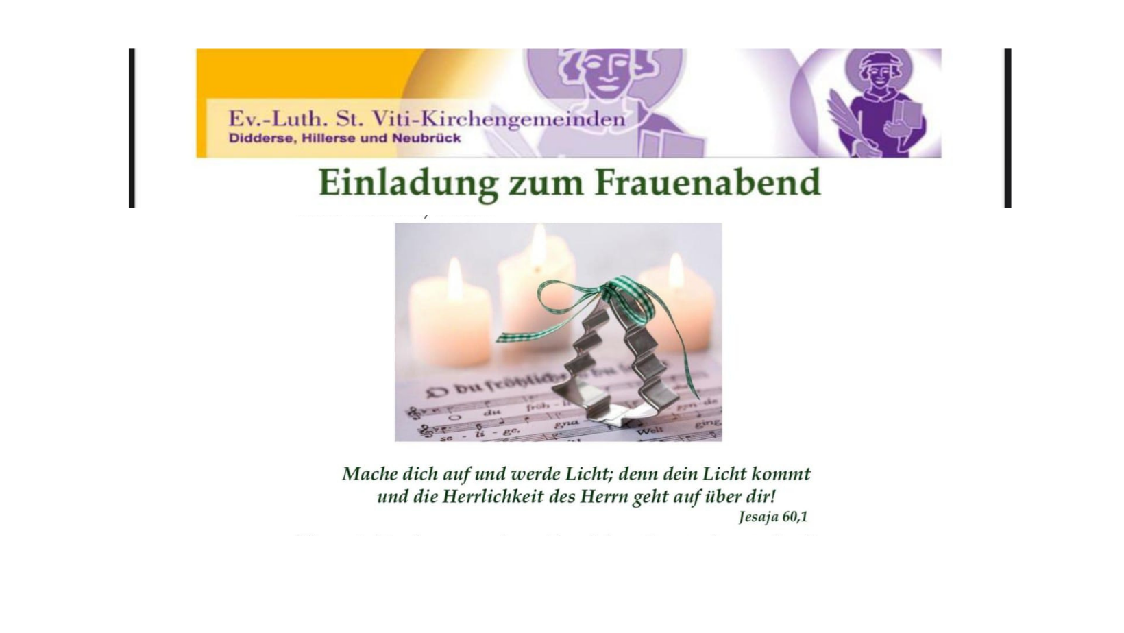 Wir möchten dich herzlich zu unserem „kreativen Frauenabend“ in gemütlicher „vorweihnachtlicher“ Atmosphäre einladen, um gemeinsam mit dir die bevorstehende Advents- und Weihnachtszeit zu beginnen. Dazu wollen wir uns am
