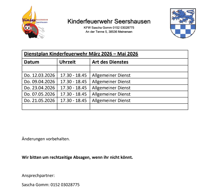 Werde ein Teil der Kinderfeuerwehr Seershausen (Dienstplan März-Mai)