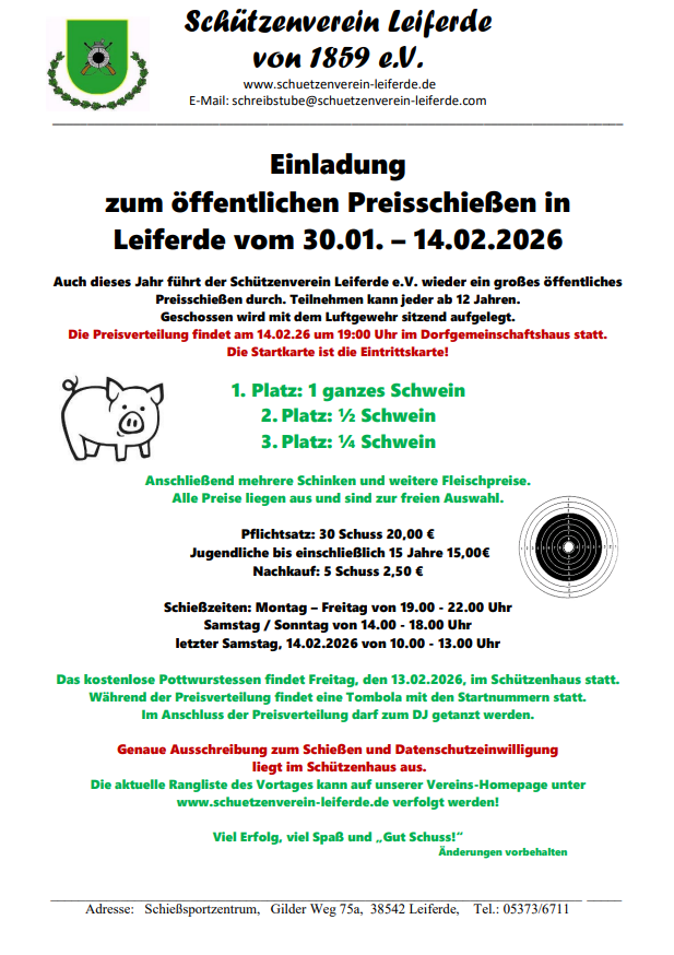 Infos gibt’s unter 'Preisschießen' auf der Homepage vom Schützenverein Leiferde. Dort findet man dann auch immer aktuelle Ergebnislisten des Vortages!