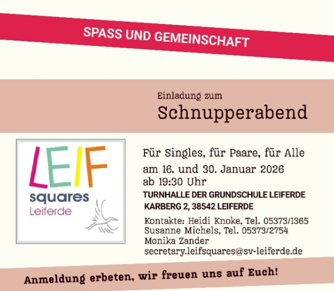 Heidi Knoke anrufen (05373/1365) Susanne Michels anrufen (05373/2754) E-Mail schreiben: secretary.leifsquares@sv-leiferde.de Euer Verein oder eure Organisation möchte Neuigkeiten, Aktionen oder wichtige Infos in der MeinersenApp teilen?