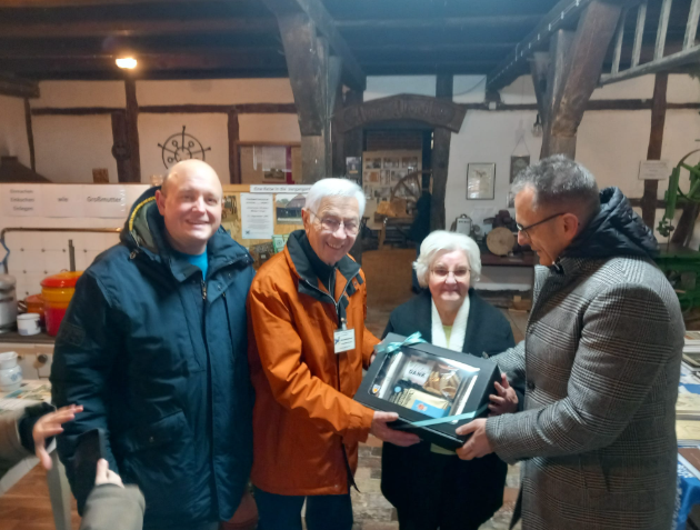 Bürgermeister Timm Bußmann und Gemeindedirektor Lutz Hesse danken Christhardt Meyer, unserem Ehrenbürger, für seine Unterstützung während der Sanierung des Bürgerhauses dafür, dass er uns das Backhaus für Besprechungen aufgeschlossen und uns mit seiner Frau Melitta Meyer jederzeit in allen Belangen hilfsbereit zur Seite gestanden hat.