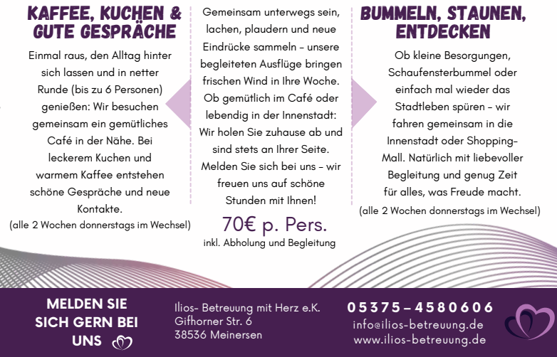 Gemeinsam statt einsam - Kaffee, Kuchen oder Stadtbummel mit Begleitung und Fahrdienst - jeden Donnerstag