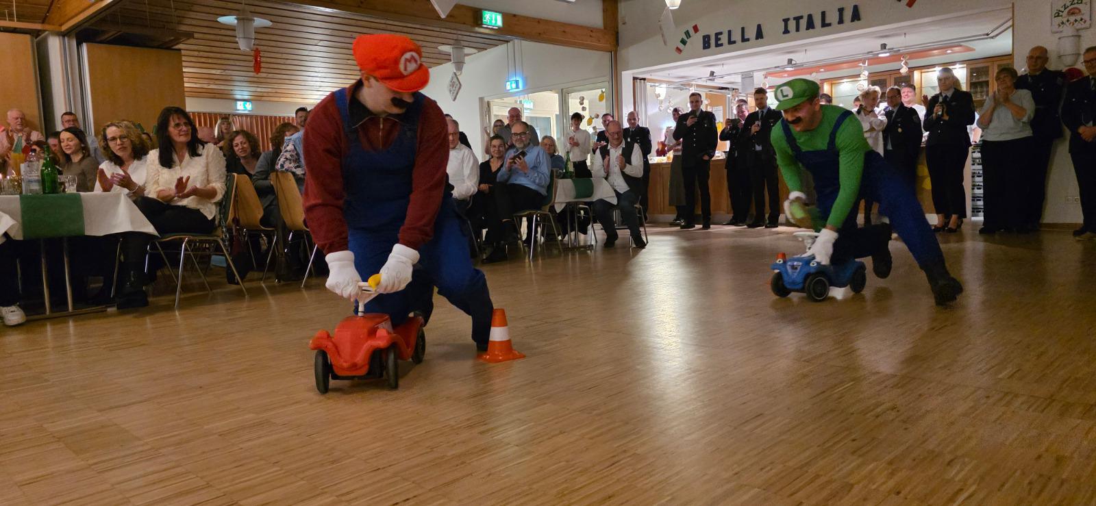 Neben Essen und Kleidung durften natürlich Autos nicht fehlen, zwei Figuren aus dem bekannten Spiel Super Mario Kart drehten auf Bobby-Cars ihre Runden um den schiefen Turm von Pisa.