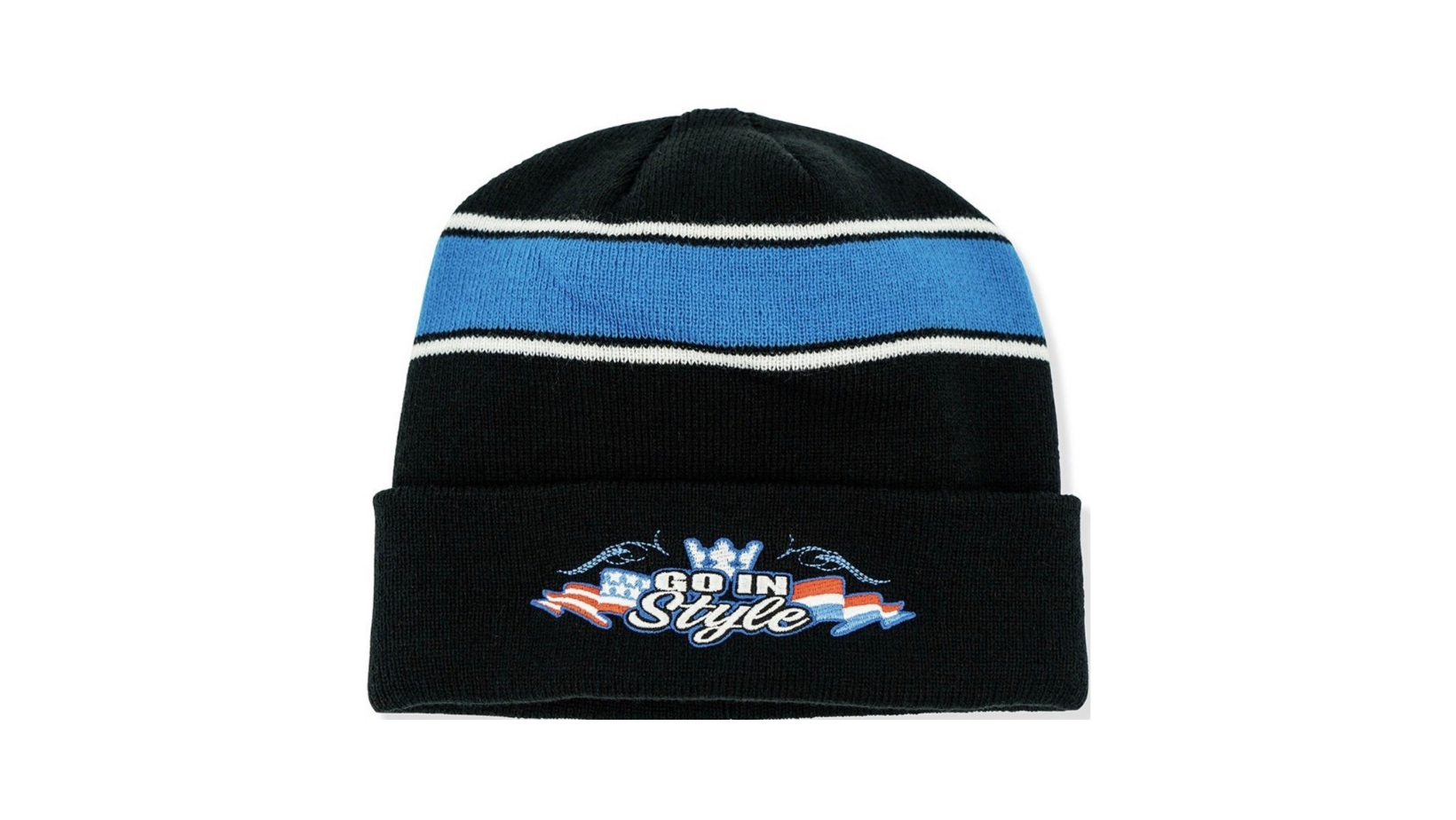 Beschreibung: Schwarze Mütze mit einem blauen Streifen und der Aufschrift „Go In Style“