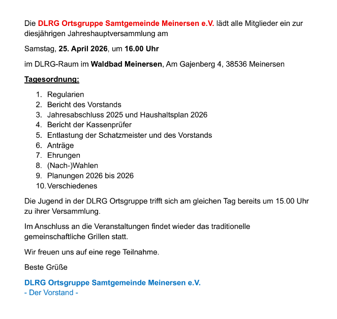 DLRG Ortsgruppe SG Meinersen e.V. lädt am 25.04.26 zur JHV