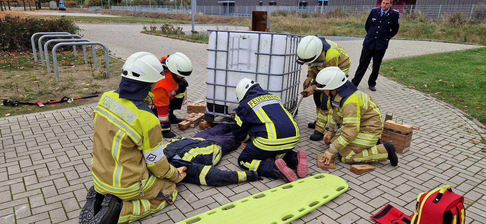 Bei den verschiedenen Einsatzlagen – vom Vegetationsbrand über kleine Feuer bis hin zu Gebäudebränden, aber auch in der Technischen Hilfeleistung - stellten sie ihr können unter Beweis. „Für die jeweils Truppführenden gab es dann immer einer Zusatzaufgabe“, so Radke. So mussten sie erkennen, dass bei einem Mülltonnenbrand die Gefahr der Ausbreitung auf ein angrenzendes Gebäude bestand oder das in einem nachgestellten Unfallfahrzeug ein Kanister mit einer Warntafel liegt. Diese zusätzlichen Gefahren galt es zu erkenne und an den Gruppenführer zu melden.