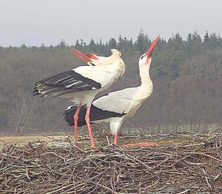 „Heute haben wir Eierschalen im Nest von Fridolin und Mai liegen sehen, das heißt der erste Jungstorch ist geschlüpft. Somit haben wir wieder pünktlich zum Storchenfest am 27.4.2025 Nachwuchs im Nest auf dem Schornstein“, berichtet Bärbel Rogoschik vom NABU-Artenschutzzentrum. „Wir sind froh, dass es zuvor geregnet hat, so ist der Boden momentan etwas feucht und die Elterntiere finden hoffentlich reichlich Regenwürmer, um die Jungtiere damit zu versorgen“.